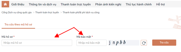Bước 3: Nhập mã hồ sơ (được in trên Giấy biên nhận, Giấy hẹn trả kết quả, trong Email nếu gửi qua Dịch vụ công). Nhập mã bảo mật, sau đó nhấn Tra cứu