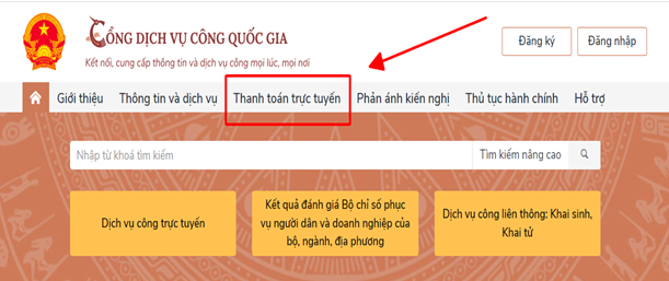Bước 1: Truy cập https://dichvucong.gov.vn/p/home/dvc-trang-chu.html , chọn Thanh toán trực tuyến