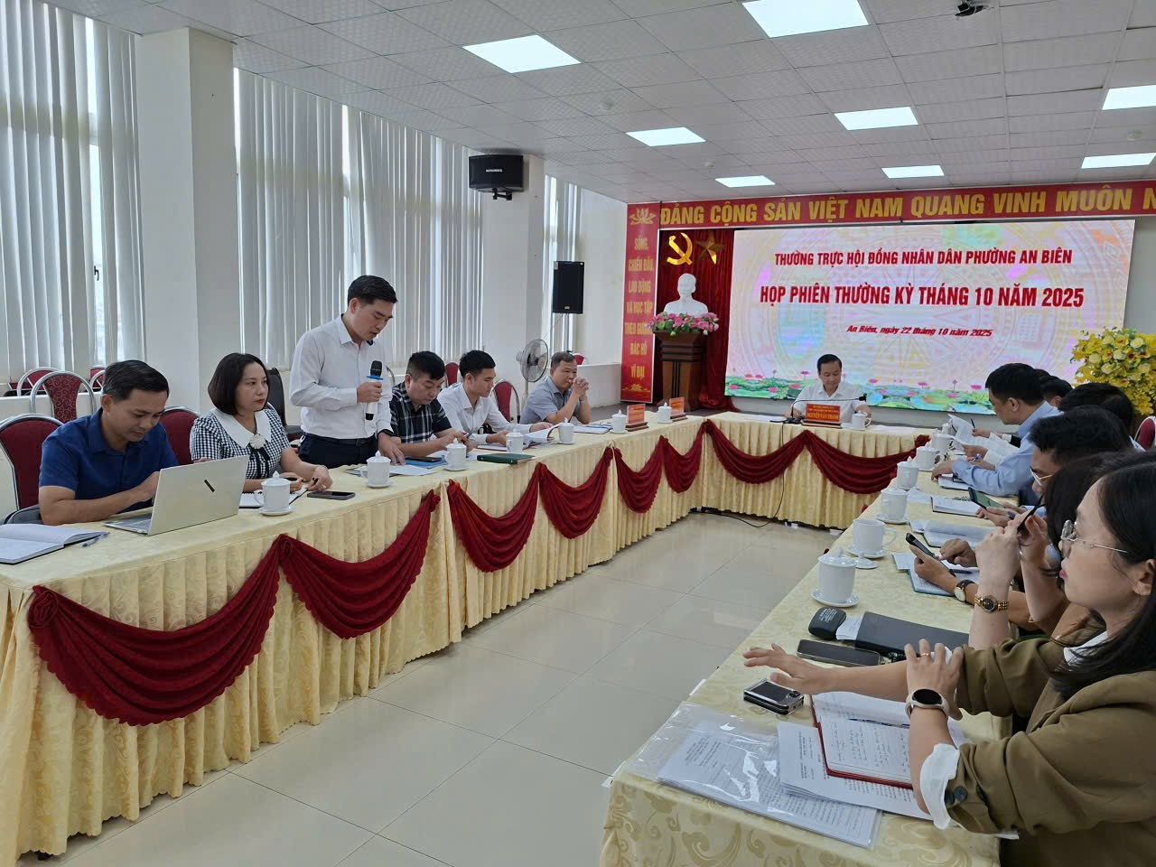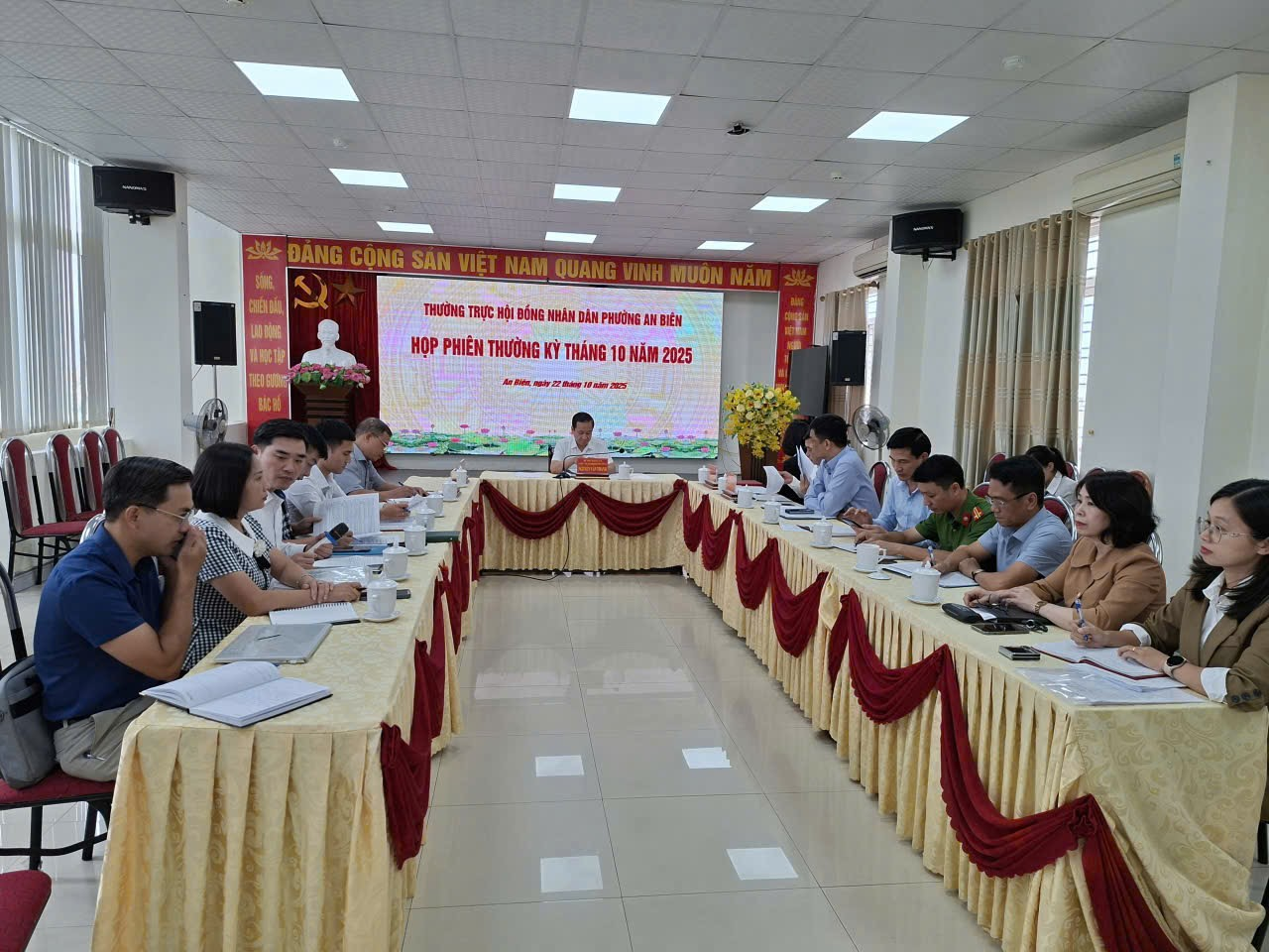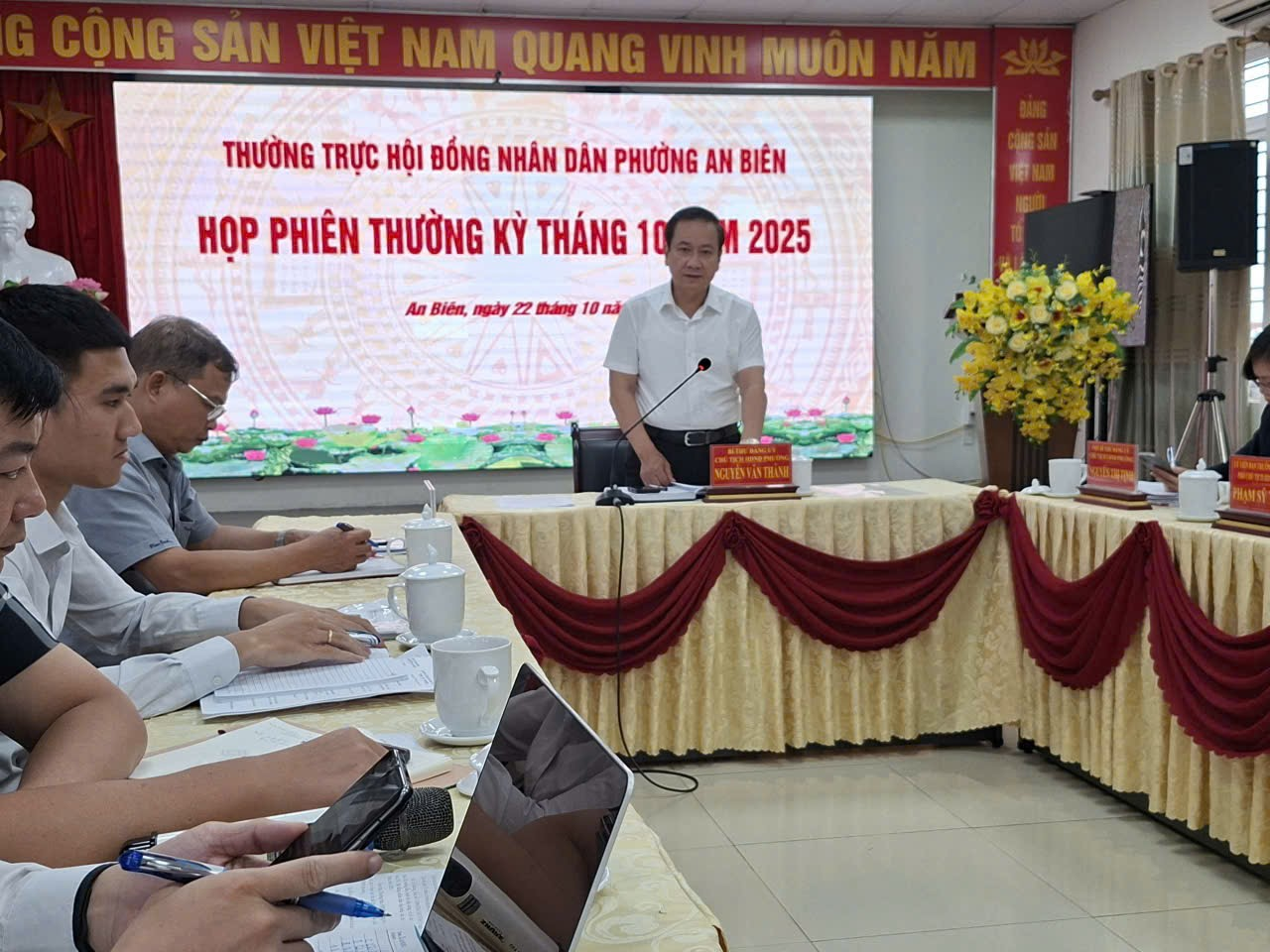 Chiều ngày 22/10/2025, Thường trực HĐND phường An Biên họp phiên thường kỳ tháng 10 nhằm xem xét, quyết định một số nội dung thuộc thẩm quyền giữa 2 kỳ họp. Đồng chí Nguyễn Văn Thành - Bí thư Đảng ủy, Chủ tịch HĐND phường chủ trì; tham dự phiên họp có các đồng chí Nguyễn Thị Tịnh-Phó bí thư Đảng ủy, Chủ tịch UBND phường; đồng chí Phạm Sỹ Tuyên - UVBTVĐU, Phó chủ tịch HĐND phường; đồng chí Nguyễn Đình Thụy - UVBTVĐU, Chủ tịch UBMTTQVN phường; các đồng chí Trưởng, Phó các Ban HĐND phường; đại diện Lãnh đạo Ban chỉ huy Quân sự, Công an, Phòng Kinh tế, Hạ tầng và Đô thị, Phòng Văn hóa - Xã hội, Văn phòng HĐND và UBND phường.